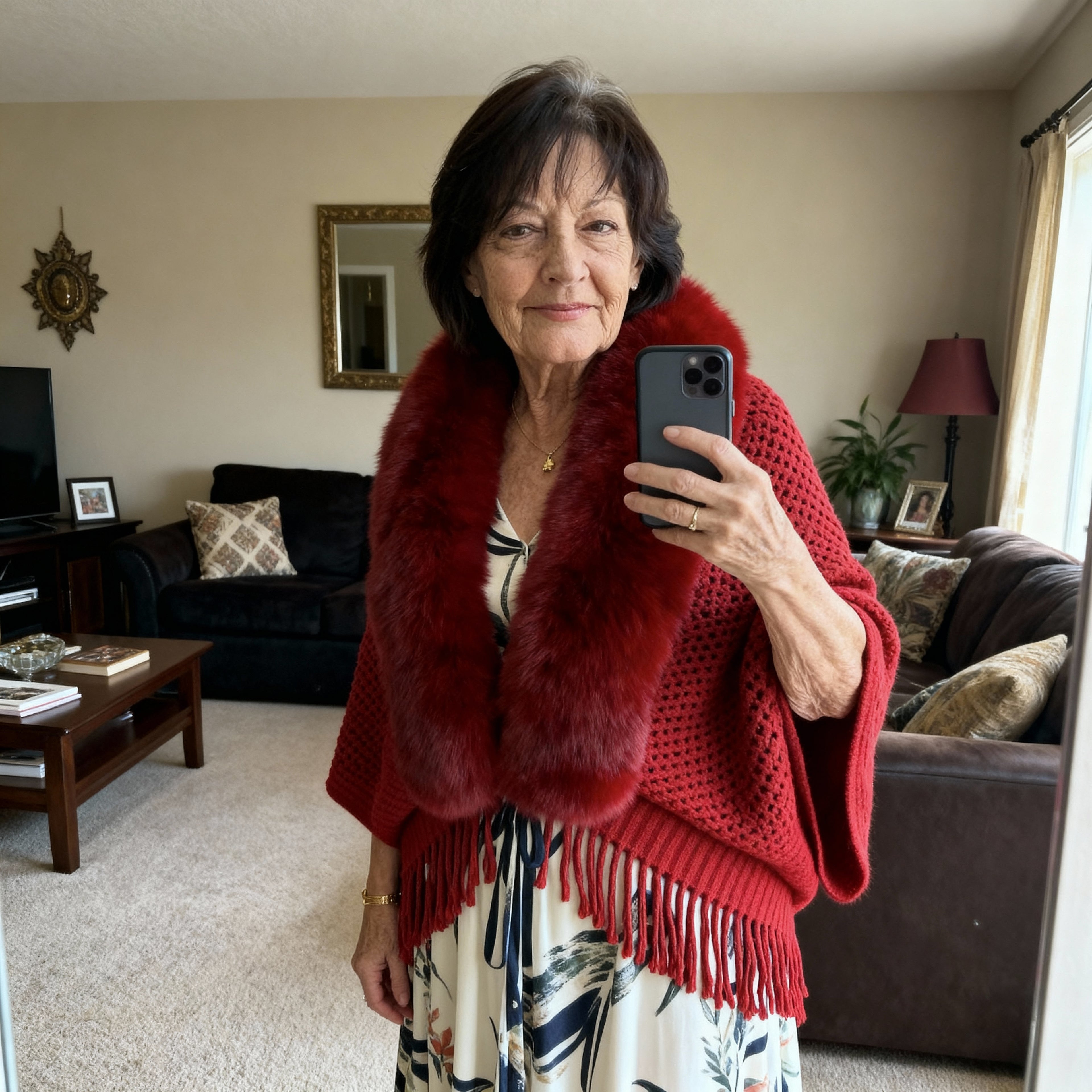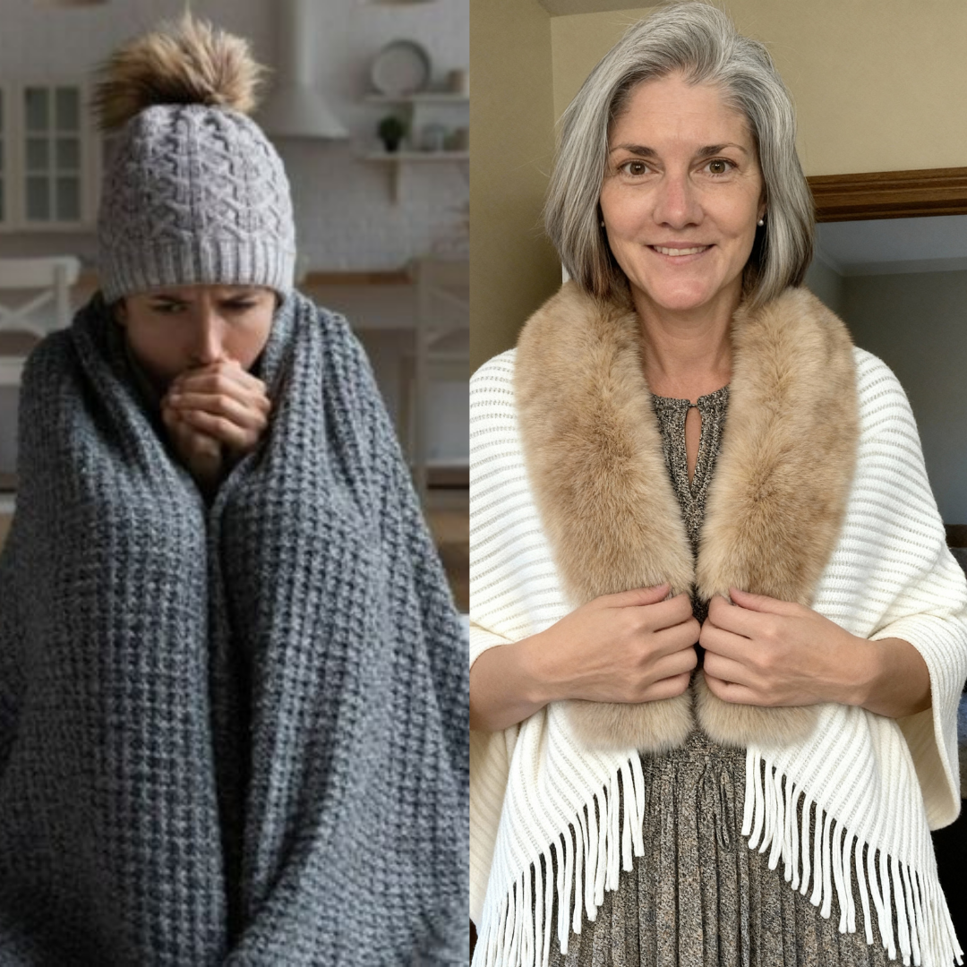 A heated shawl provides consistent, gentle warmth, helping her stay comfortable without exposing her skin to harsh cold that can worsen irritation.